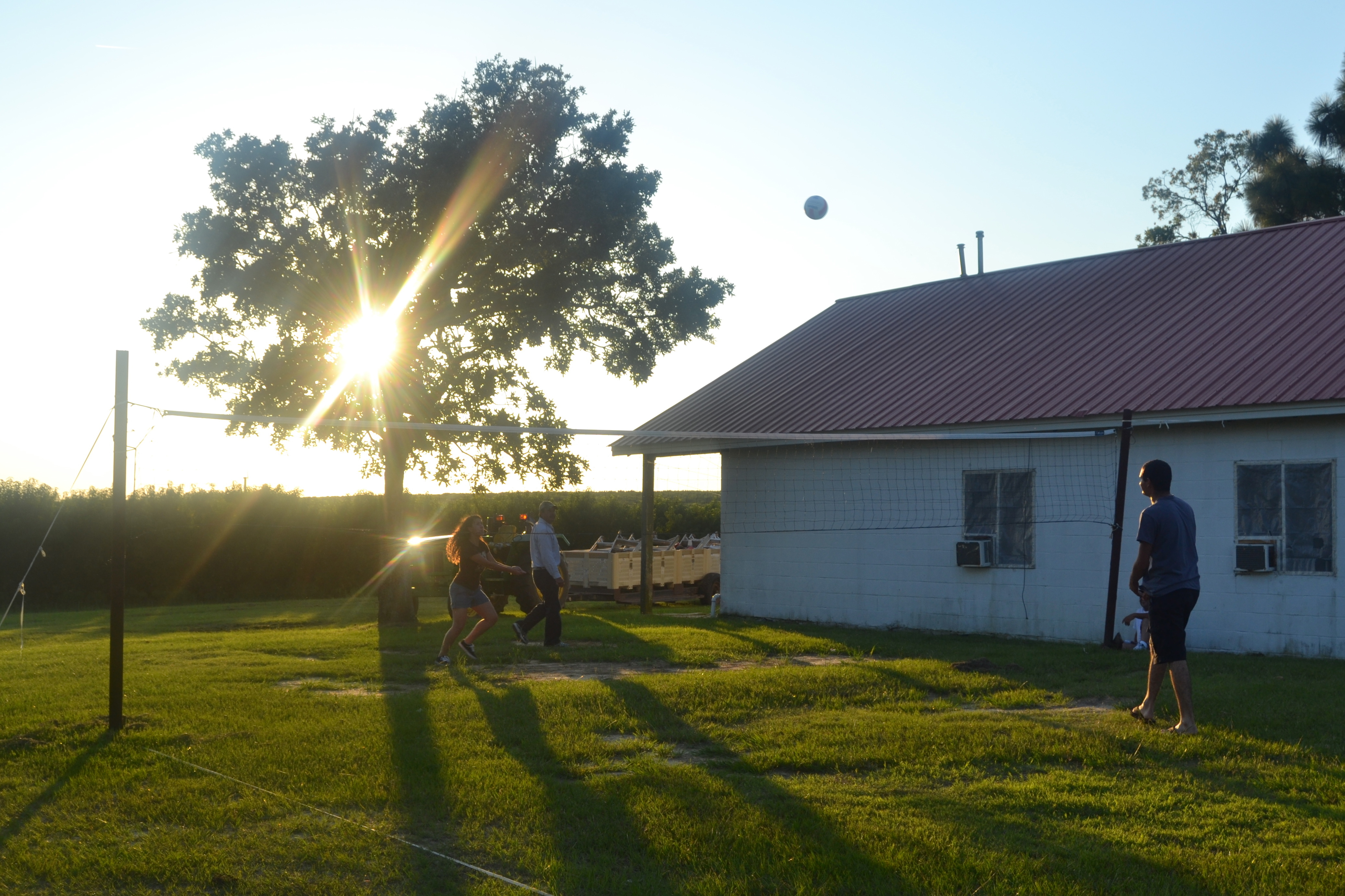 While Danny went inside to recruit someone to interview, Julie headed to the volleyball net. Volleyball? Soon she was punching the ball to a guy on the other side, who lost sight of it in the glare of a setting sun now falling toward peach trees surrounding the camp. He laughed.