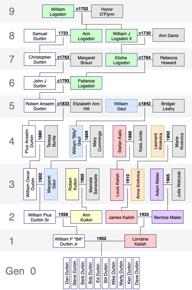You’ll notice that our great-great-great-great-grandfather, John J. Durbin, married Patience Logsdon, with whom he shared great-grandparents William Logsdon and Honor O’Flynn. This made them second cousins. (Third cousins share great-great-grandparents, and so on.)